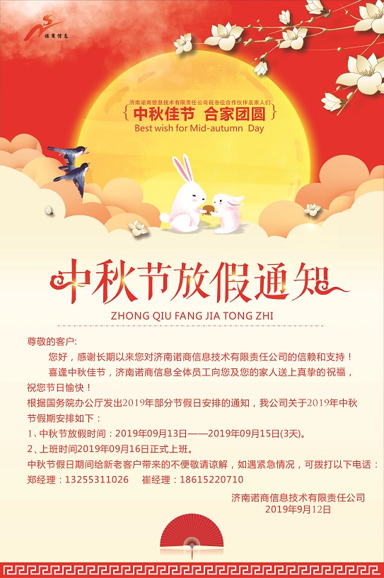 2019年鑫鑫諾商中秋節(jié)放假通知