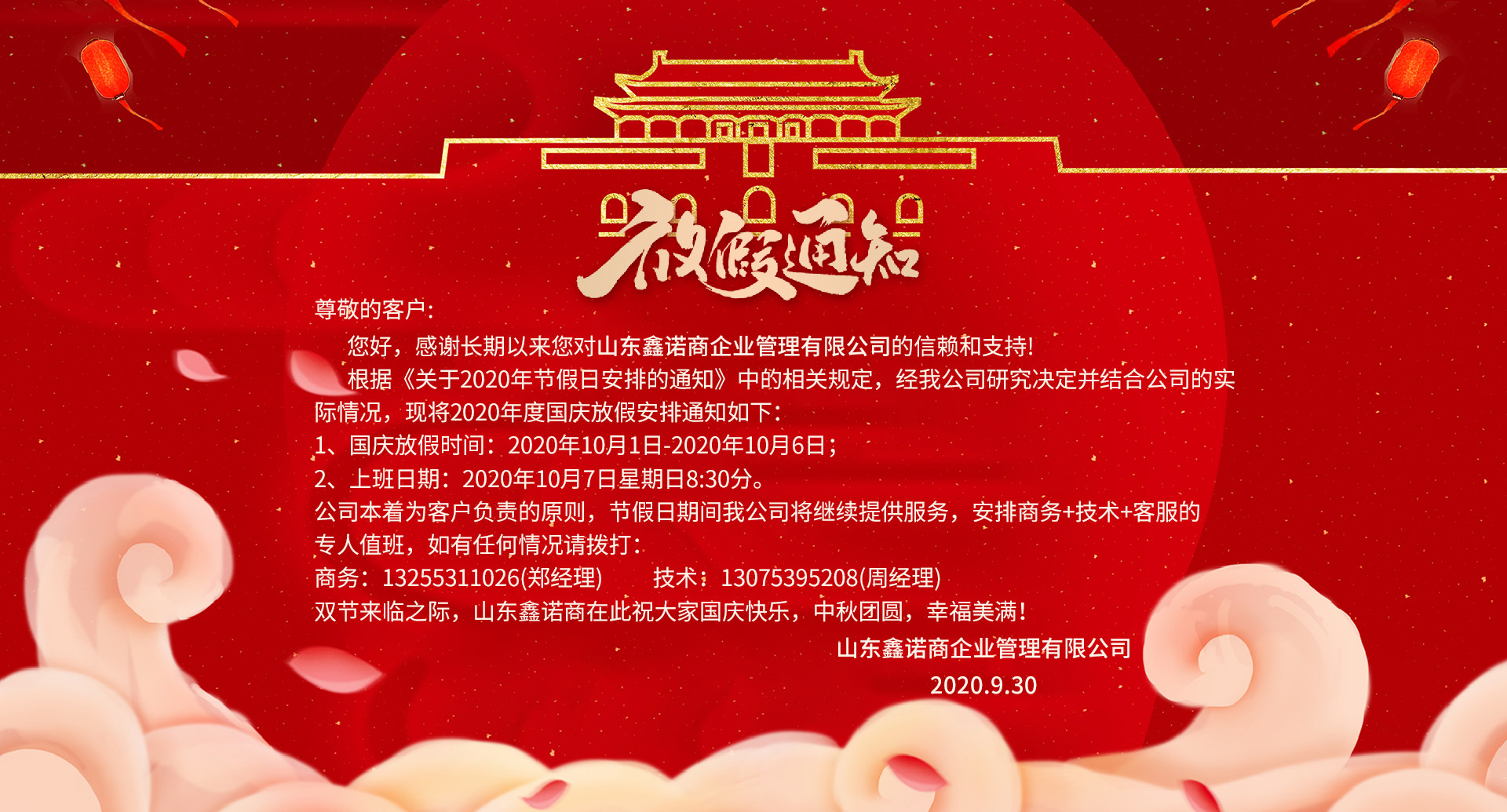 謝大家一如既往的支持與厚愛,山東鑫諾商在此祝大家國慶快樂,中秋團圓,幸福美滿!